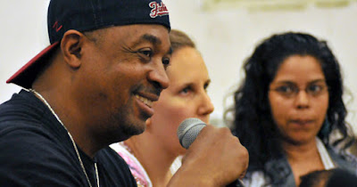 ”Ya sobre el final de encuentro, el autor de “Rebelde Sin Pausa” tuvo un dialogo con sus admiradores, donde no faltaron las palabras de aliento y esperanza: “Yo les digo, acá en Buenos Aires, en Córdoba o en cualquier otro lugar del mundo, el hip hop puede ser mejor que el de EEUU sólo si ustedes creen en si mismos. Pero si le escapan a la verdad y tratan de ser de otro lugar, no van a tener los fundamentos suficientes como para pertenecer al mundo del hip hop. Hace 35 años que ésa es la regla universal del hip hop. (...) El problema más grande en EEUU es que el movimiento ha sido individualizado. Ya no es algo para muchos, sino para el artista en si mismo. Desaparecieron los grupos y las mujeres del hip hop. Desaparecieron la colaboración entre los (cuatro) elementos del hip hop. El aislamiento siempre será malo. Pero la organización siempre necesita de una chispa para comenzar."